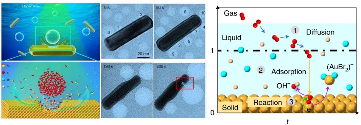 固-液-气反应广泛存在于自然界和工业过程中,如多相催化、金属腐蚀、氢氧燃料电池反应、大气腐蚀等。充分描述气体在液体中的传输和固-液-气三相反应是非常重要的,但是由于体系的复杂性,学术界一直缺乏对反应动力学的定量分析和对固-液-气三相表面气体传输机理的准确理解。在杨俊伟老师等人开展这项工作中,通过电子束辐解水产生氧气气泡,用电子显微镜观察氢溴酸水溶液中的氧纳米气泡对金纳米棒的刻蚀作用。结果表明,当氧纳米气泡和金纳米棒之间的距离小于临界距离(1 nm)时,局部刻蚀速率增加了一个数量级以上,否则刻蚀速率几乎不变。经典分子动力学和从头算分子动力学模拟结果表明,当纳米气泡与金纳米棒表面之间的液层厚度大于1 nm时,纳米气泡释放的氧分子通过液层扩散,通过浓度梯度到达金纳米棒表面,这个过程很慢。而当纳米气泡与金纳米棒表面之间的液体层厚度减小到1 nm以下时,氧分子在范德华力的作用下迅速吸附在金纳米棒表面,氧分子在固体表面参与反应,从而大大加速了刻蚀反应。本工作的研究成果为合理设计固-液-气反应以提高活性提供了启示,对未来涉及固-液-气相的微纳加工和多相催化的调控具有重要意义。