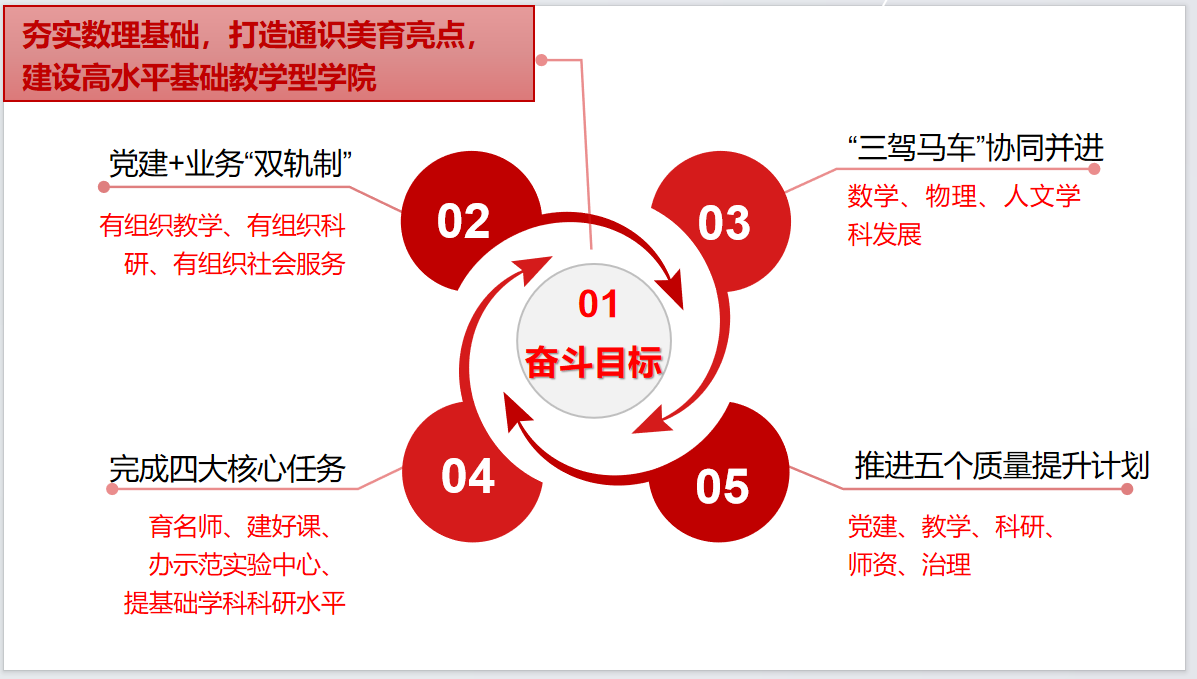 副院长吉文斌对暑期教改调研工作做了总结,并对开学阶段教学工作做了布置。他结合学院班子的主题教育调研成果,作了题为“如何加强高水平基础教学型学院建设的思考”的报告。报告深入分析beat365英国官方网站在建设高水平基础教学型学院过程中的痛点问题、难点问题、弱点问题、堵点问题等,根据学院班子在主题教育期间的调研成果,提出“12345”的学院建设思路:“1”是实现一个奋斗目标,即夯实数理基础,打造通识美育亮点,建设高水平基础教学型学院;“2”是推进“党建+业务”的“双轨制”建设,促进有组织教学、有组织科研、有组织社会服务;“3”是“三驾马车”协同并进,推进数学、物理、人文三个学科高质量发展;“4”是落实四大核心任务,即做好育名师、建好课、办示范实验中心、提基础学科科研水平等四方面重点工作;“5”是实施五个质量提升计划,即党建质量提升计划、教育教学质量提升计划、科研水平提升计划、师资队伍提升计划、治理能力提升计划。吉文斌指出,beat365英国官方网站正处在推进高质量发展的重要机遇期,全体文理人要继续弘扬务实的文理之风,努力办好开放的beat365英国官方网站,齐心走出奋进的文理之路,为创造beat365英国官方网站更美好的明天而协同努力!