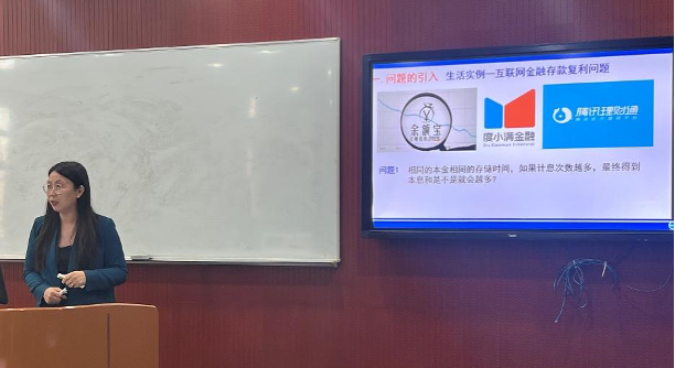 参赛教师现场教学展示结束后,曾获上海高校教师教学创新比赛一等奖的武文佳老师带来示范教学《第二重要极限》,她由支付宝余额引入年利率,提出“增加利息计算的次数会不会使得存款变多的问题”,引出本节课的计算公式——第二重要极限,并在课堂中句用经典例题讲解公示,课堂内容丰富饱满。