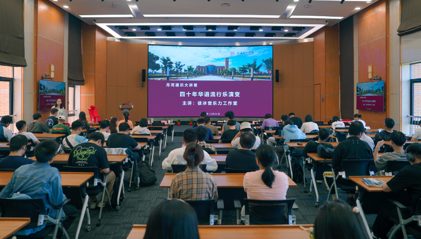 10月27日,“月河通识大讲堂”本学期首场讲座邀请中国音乐家协会会员、中国流行音乐学会理事、上海黑胶文化研究专业委员会会长、上海古凡交响乐团首席策划徐冰,著名唱作人、上海古凡交响乐团特邀歌手董晓禾在行政楼330带来题为《四十年华语流行乐演变》的主题讲座。副校长杨万枫,对外联络处处长、校友会办公室主任卞一明,beat365英国官方网站直属党支部书记董雪静等出席,活动由beat365英国官方网站副院长吉文斌主持。全校一百余名师生沉浸其中,以音乐为载体,触摸“时代力量”、感受创作初心。