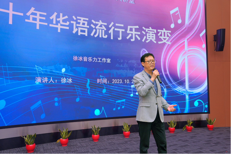 讲座中,徐冰老师作为亲历者和参与者,将四十年华语流行乐的演变凝练为为开放气态下的明媚之光、唱片工业的辉煌时代、网络草根歌曲热潮、泛娱乐与跨界时代气象四个典型时代特征。徐老师带领同学们“回到”40年前,讲述了流行歌曲从一开始被批判为“靡靡之音”,到现在在人民大众心目中成为美好的旋律,每个人都可以哼唱;再到八十年代的校园民谣、九十年代的四大天王;再聊到新世纪的超级女声、粉丝经济、AI对音乐生态的冲击、华语流行乐是世界的关系……徐老师作为40年来内地流行乐的活目录,信手拈来,便是一段精致的妙语点评,他说道:“在改革开放以前的上海民间,上海话我们叫‘老克拉’,私下里喜欢抱着吉他,在音乐厅里演唱一些当年的欧美流行歌曲,流行音乐的传承就没有断过;1979年改革开放开始,上海的流行音乐之传承,更有了一个发扬光大的理由。”