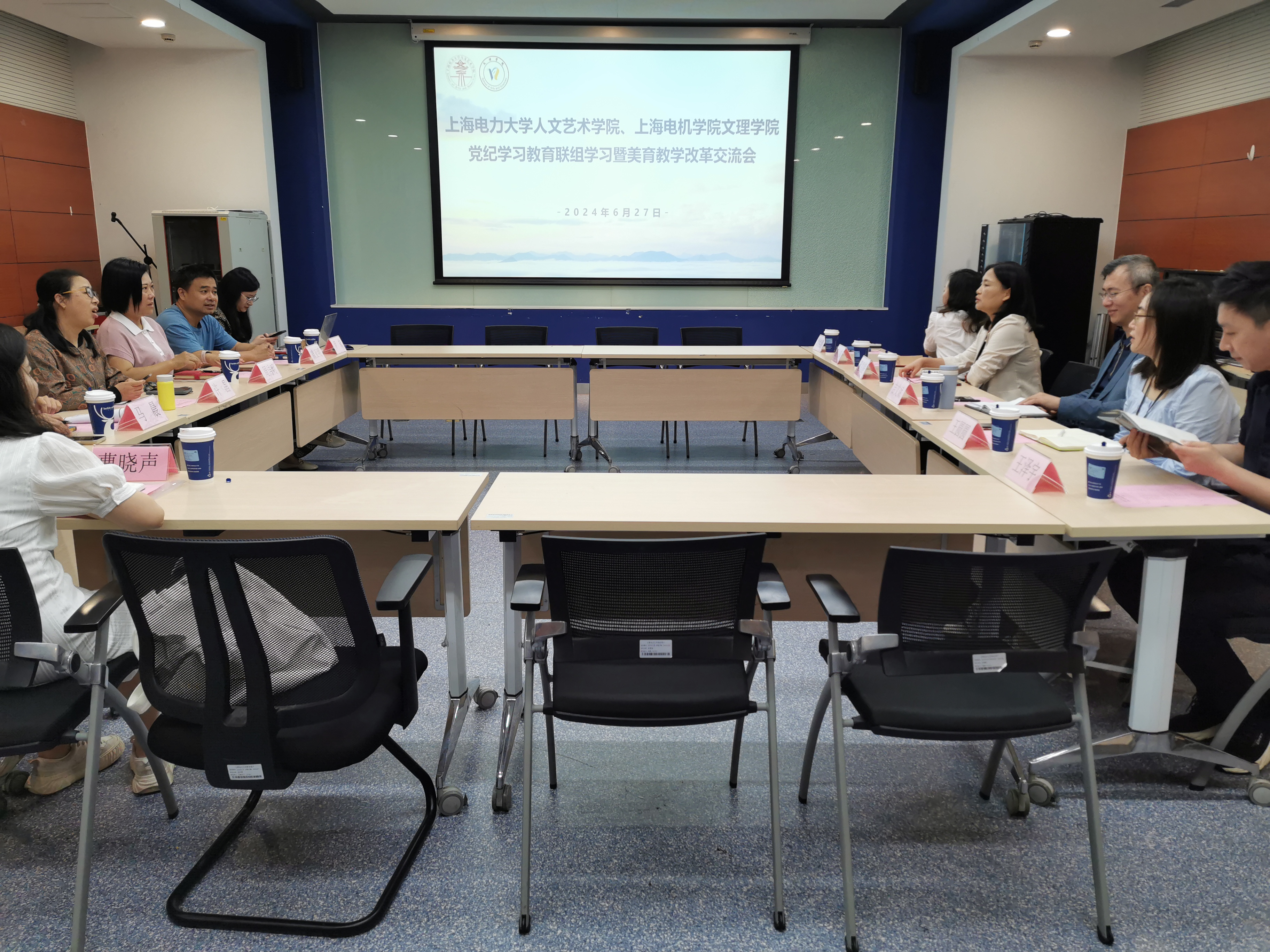 为扎实开展党纪学习教育,全面学习贯彻《中国共产党纪律处分条例》,引导党员干部把纪律规矩转化为政治自觉、思想自觉、行动自觉,近日,beat365英国官方网站人文美育教研室一行赴上海电力大学,与人文艺术学院艺术教研室开展党纪学习教育联组学习暨美育教学改革交流会,会议由beat365英国官方网站直属党支部书记董雪静和上海电力大学人文艺术学院党总支书记周洁明共同主持。