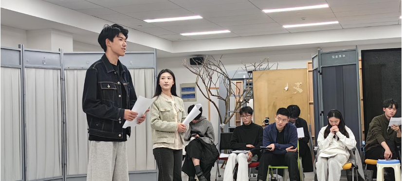 作为课堂互动环节,我校机械工程专业学生李同学、电子信息专业学生王同学等现场即兴朗诵了《祖国啊,我亲爱的祖国》选段及古诗《春江花月夜》。董健教授针对工科学生的语言特点,从发声技巧、情感表达与文本理解等方面进行了细致点评:“工科生的逻辑思维优势让语言结构更清晰,但要注意语句重音的层次感、声音的松弛度,还要有角色代入感。”精准的指导让学生们直呼“茅塞顿开”,计算机专业学生陈同学表示:“原以为语言表达是‘文科生的专长’,没想到工科生严谨的思维与艺术的感性可以这样巧妙结合,今后在科创答辩、学术汇报中也能更有感染力。”在这堂课上,工科生的理性思维与艺术的感性表达相遇,严谨的逻辑与灵动的语言共振,美育的种子已在跨界融合中悄然生根。课程尾声,上戏学生以压轴形式呈现了全国第六届中华经典诵写讲大赛 “诵读中国”经典诵读大赛国赛一等奖作品《那一年,中国青年正十八》。表演者们用极具张力的舞台语言和沉浸式演绎,回溯了百年前中国青年在时代洪流中勇担使命的奋斗图景,青春之声激荡教室,让在场师生透过声音的力量触摸到历史的温度。随后,两校师生共同朗诵了《可爱的中国》选段,铿锵的声音在教室中回荡,将课堂气氛推向高潮。